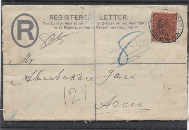 Finally I have one used registered envelope sent to Accra, Gold Coast and one postcard to the UK: