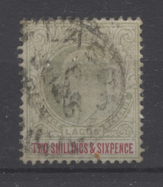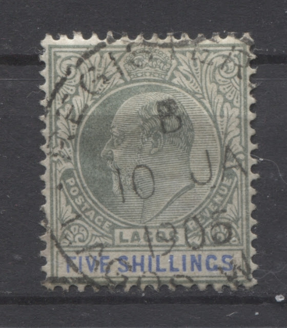 Not a good used example of this high value, but the best one that I have. It is almost completely faded, having only about 25% of its original green colour. It has a messy but readable strike of a June 25, 1904 Lagos CDS cancel. Like I said earlier, as terrible as it is, it is still one of only about 125-150 in existence.
