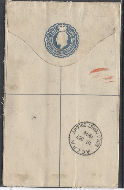 The front of a registered envelope, printed in a deeper shade of the grey blue, but the same size as the mint envelope shown earlier. This was sent to Accra, Gold Coast on October 15, 1904. Accra, was considered to be an inland destination, even though it was another colony, and was this rated at 1d, so that the registered envelope required only a single 1d stamp.
