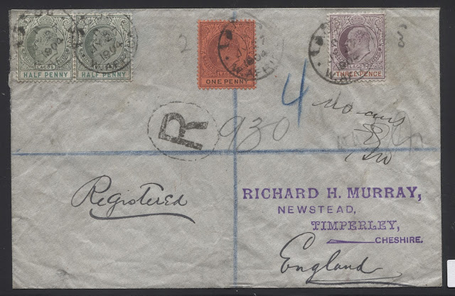The normal postage rate to the UK at this time was 2.5d, and registration was 2d, for a total of 4.5d. So this cover appears to have been overpaid by 1/2d, which is odd, given that there is a pair of 1/2d stamps on the cover. but the placement of the 1d stamp is such that it looks like it was applied after the blue registration markings were drawn on the envelope. It seems that the clerk noticed that the envelope was only franked with 4d, and needed to make up the deficiency, but did not have any more 1/2d stamps, and so used a 1d instead. It would further appear that there was no answer when delivery was attempted as indicated by the "No Ans" notation in pen on the front.