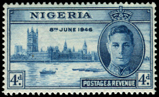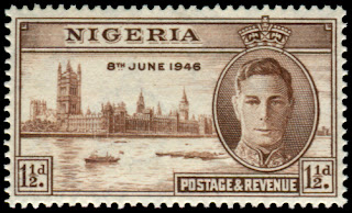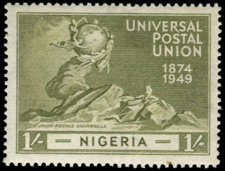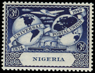 Next, in 1949 the Universal Postal Union marked its 75th anniversary, and a very nice set was issued to mark the anniversary. Nigeria's set was the work of De La Rue, who printed the 1d and 1/- values, and Bradbury Wilkinson who printed the 3d and 6d values. All countries issued 4 stamps and the denominations were intended to pay the local circular rate, the foreign surface rate, and the 1/- was a make up stamp used in combination with other values to pay airmail rates. The stamps were issued on October 10, 1949.