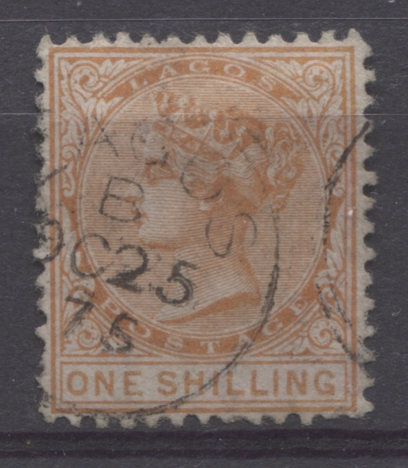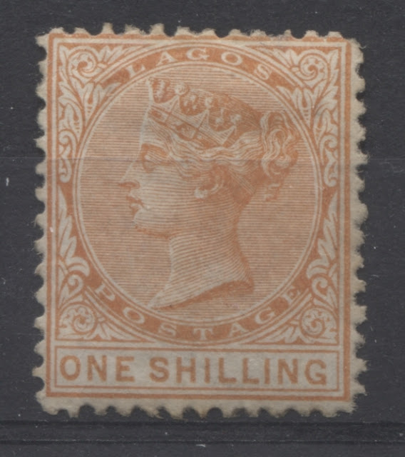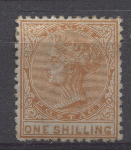 Today's post will deal with the sixth and final value in this first issue of Lagos: the one shilling orange. This stamp had the fewest number of printings, with only four dispatches between November 18, 1874 and May 13, 1875.