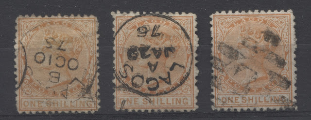 This concludes my coverage of this value, and thus the first issue of Lagos. In 1876, De La Rue changed the perforation of its stamps from 12.5 line to 14. As we shall see, until 1880 the method of perforating was line, but in 1880 printings were made that were comb perforated. My next series of posts will look at these second issues, being those watermarked crown CC and perforated 14.