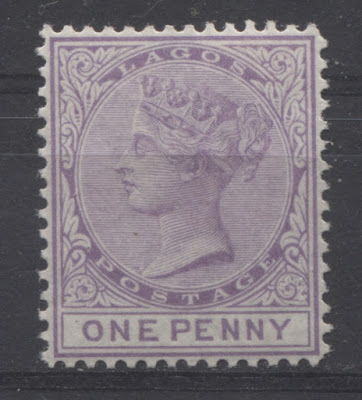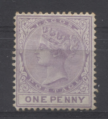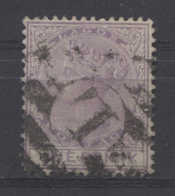 Although there is a bit more red in this shade, it is very close to the bluish lilac of the mint example above. It also has the uneven corner perforations, characteristic of a line perforation. Finally, and as expected, it is cancelled with a Lagos barred diamond obliterator.