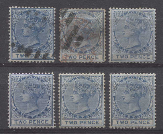 Today's will explore the six printings of the 2d blue from the second crown-CC keyplate issue of Lagos. This is a much more difficult stamp to sort than the 1d, due to the number of printings. I believe that the last two printings were comb perforated, while the first four were line perforated.