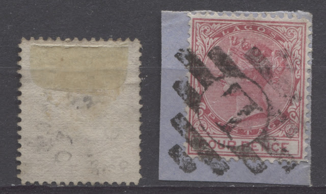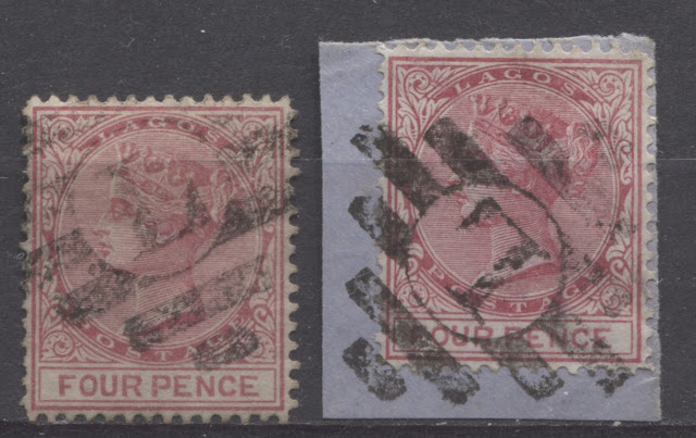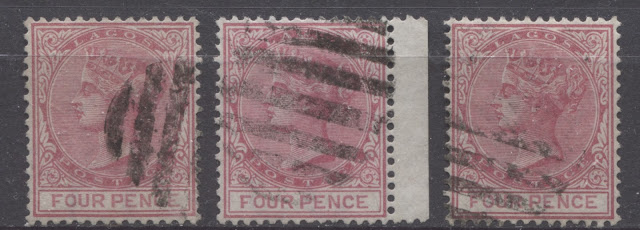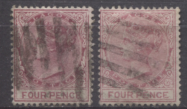 Here we have a deep rose that is dull, but not bluish. The example on the left has the Lagos diamond barred grid cancel, while the one on the right is cancelled with the barred oval grid. Both stamps are clearly line perforated, because of the uneven corner perforations.
