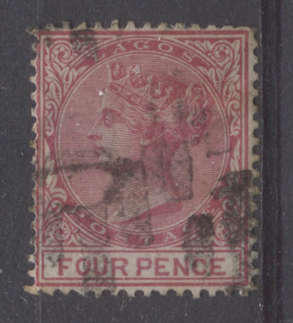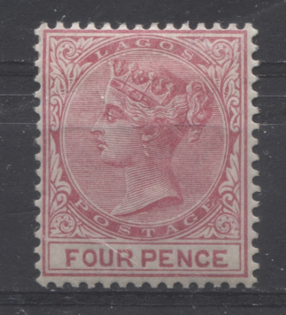 The colour of the stamps from this printing is a deep rose, with no bluish undertone. Occasionally, it can be found in a dusty rose, but it lacks the intensity and bluish tone of the earlier two printings. Again, the head plate and duty plate colours match. In the line perforated stamps, it is the most common of the first three printings, and it was the sheer number in my stock compared to the other printings that led me to classify it as this printing. About three quarters of the used examples that I have seen are cancelled with the Lagos diamond barred grid cancellation, while the other half have the barred oval grid cancel. I have one mint example and several used examples in three different shade groupings, which I will show below.