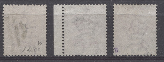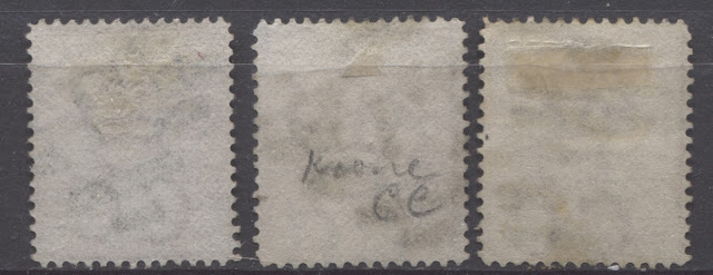 Looking at the backs, you can just make out the vertical mesh, and on 2 of the three stamps, the watermark is clearly visible.