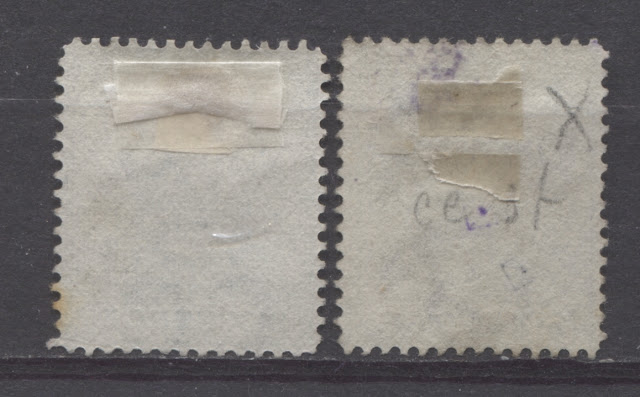 Looking at the back, we see two types of paper. The one on the left shows very feint, vertical mesh, with good visibility of the watermark. The second is the usual smooth paper that shows no obvious mesh. Both stamps have the thin, colourless gum that is commonly found on the crown-CC stamps of this period. This is not inconsistent with the papers that we find on the other values from this period, with some appearing to exist on only one type, while others seem to exist on both types.