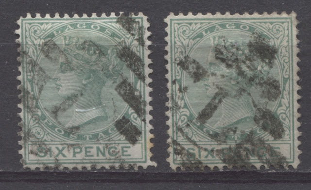 Notice that the colour of both stamps above is bluish and milky. Both are cancelled with the Lagos diamond barred grid cancel.