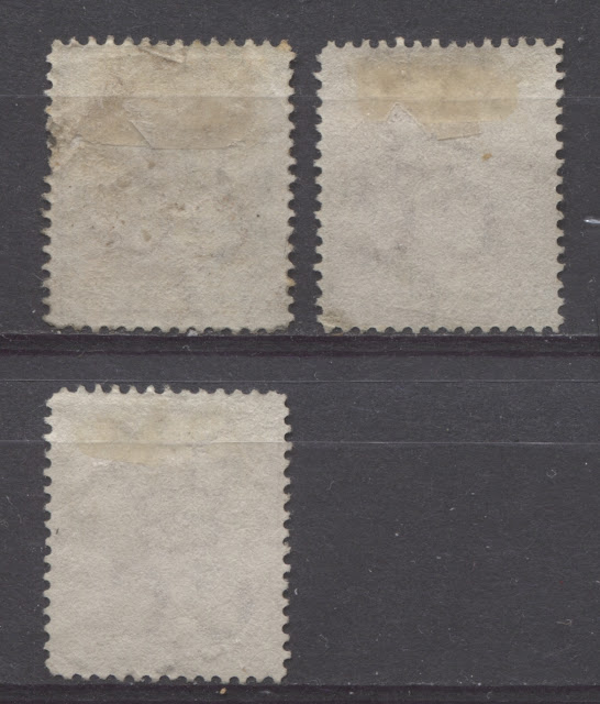 Looking at the backs we see that all the stamps are on a smooth, white wove paper that shows no clear mesh. The watermark in all three cases is faintly visible, as in the case of the second printing.