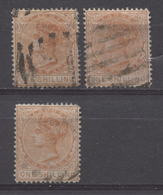 Today's post brings us to the end of the second crown-CC definitive issue of Lagos, with the 6d green and the 1/- orange. According to Ince, there was only one printing of the 1/- orange, which was dispatched on November 26, 1879. This consisted of 96 sheets of 60 stamps, totaling a mere 5,760 stamps - an absolutely minuscule printing, making it one of the scarcest stamps of Nigeria. Despite there being only one printing, all of which were line perforated, it would appear that more than one press run may have been required to fill the requisition, as I have found at least two shades of orange on this stamp.