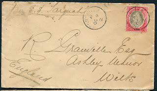 The cover is franked with a single carmine and sepia 1d Queen Victoria keyplate definitive, tied by a single strike of Proud type D2 CDS. The S.S. Tarquah was a commercial ocean liner that was built by Stephen and Sons Ltd. in Glasgow in 1902, so this cover was sent in its first year of service. The ship was sunk on July 7, 1917 by a German U-boat. The back of the cover shows a Chippenham receiving handstamp dated October 28, 1902.