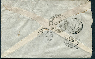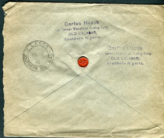 The next cover was a single weight envelope from the same correspondence as the second and third covers above, sent from Calabar to Lome, Togo on August 26, 1910.