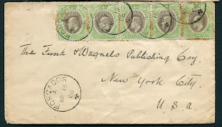 The next cover is a single weight cover to the Funk and Wagnalls Publishing Company in New York. It was sent on March 15, 1908 from Forcados River