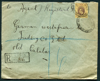 The next cover is a single weight registered cover sent from Lagos, on November 29, 1909 to Old Calabar: