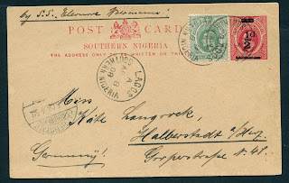 The last item is another scarce commercially used example of the 1/2d surcharged postcard from Southern Nigeria, sent from Lagos to Halberstadt, Germany, on April 8, 1908: