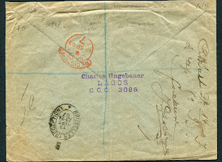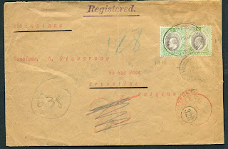 The fourth cover in the lot is one of my favourites. It is a registered single weight cover sent from Lagos on April 28, 1907 to Brussels, Belgium: