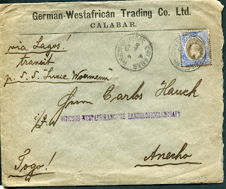 The next cover is a double weight cover from the German West African Trading Co. in Calabar, to Lome in Togo: