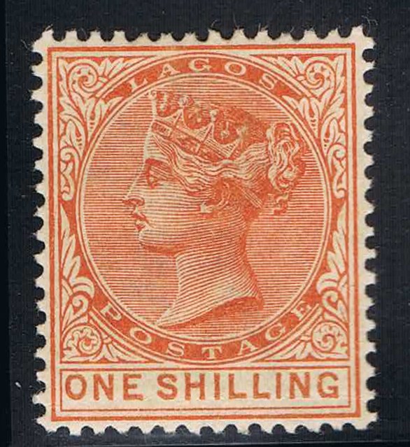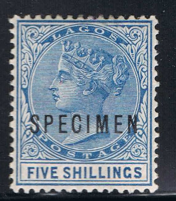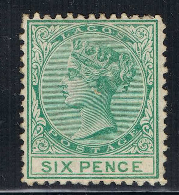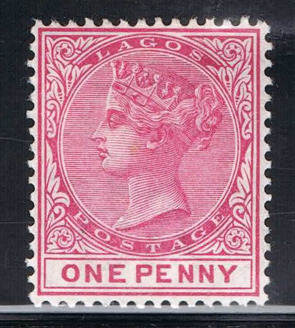 This is Nigeria's first stamp, issued in 1874. The first series of these stamps, which were in use until 1876, were line perforated 12.5. They were printed in two operations from two plates; one being used to print all parts of the design except the words of the face value. In addition to the 1d lilac shown above, there were five other denominations: a 2d blue, a 3d chestnut, a 4d carmine, a 6d green and a 1/- orange. The paper on these first two series was gummed with a very thin, colourless and matte gum. Most unused examples of these stamps are found either without gum, or they have been regummed. Original gum is not often seen.
