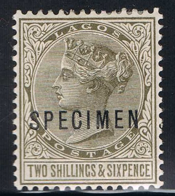 The 2/6d olive black was issued in 1886, along with the 5/- and 10/- values. These stamps are all very rare, with only 900 of the 2/6d being printed. The above example is a specimen that was so marked for distribution to the Universal Postal Union, so that other countries postal administrations could tell that they were valid stamps. The high values in the single colours were only in use for a year or so before the bicoloured green designs replaced them.