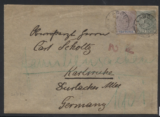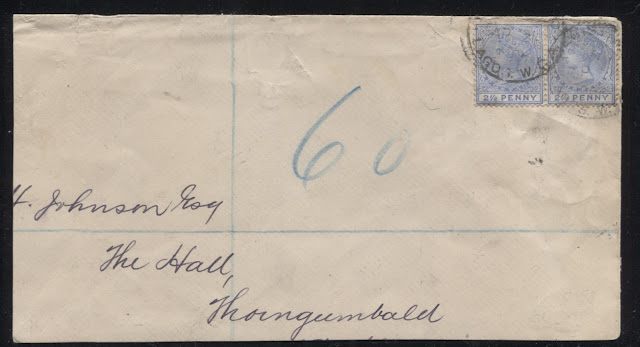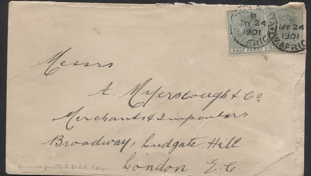 Another Myerscough cover. This time it is a 1d regular mail cover, that was sent from Ebutte Metta on May 24, 1901. The postage has been paid with two 1/2d green stamps from the 4th state of the plate, so somewhat late usage. The stamps are tied by clear strikes of the Ebutte Metta 24 mm CDS cancels.
