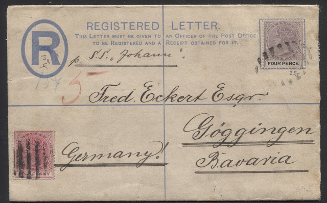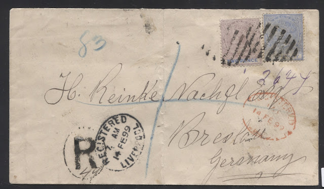 Another 4.5d registered cover, sent from Lagos to Breslau, Germany, that was sent on January 21, 1899. The postage is paid with singles of the 2.5d ultramarine and 2d lilac and ultramarine. The 2d appears to be from the third state of the plate, and the 2.5d appears to be from the 4th state of the plate. Both stamps are canceled with strikes of the 8-bar oval obliterator of Lagos.