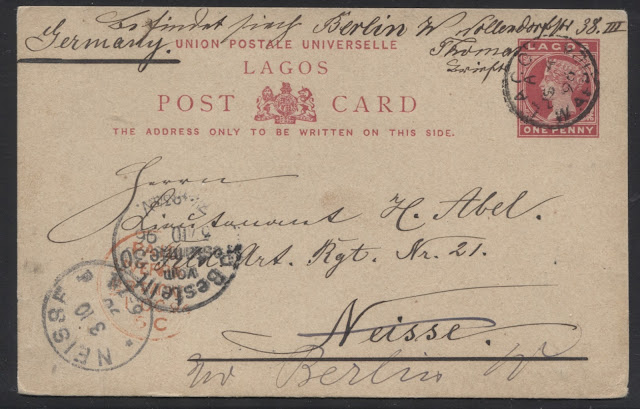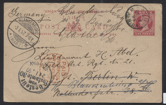 Another 1d postcard that was originally sent to Berlin on December 7, 1896. It arrived there on January 21, 1897, where delivery was attempted and failed. The address was stroked out and it was re-directed to Blankenburg, where it arrived on March 1, 1897. The Lagos cancellation is a 21 mm CDS with a 4 mm gap between the "W" and "A".