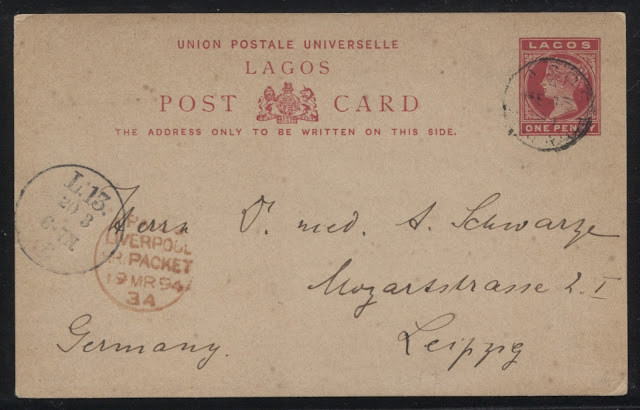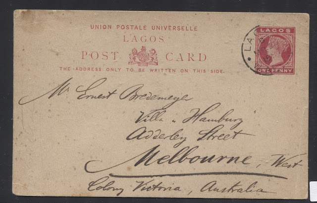 A 1d postcard, sent from Lagos on March 20, 1897 to Melbourne, Australia. Cancelled with a strike of a 24 mm Lagos CDS.