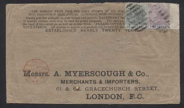 A 2.5d cover sent from Lagos to A. Myerscough in London, on December 13, 1896. Myerscough was a leading stamp dealer at the time. The postage was paid with a single 2d lilac and ultramarine and 1/2 deep grey green, both from the third state of plate 1. The stamps are tied to the cover with strikes of the 8-bar Lagos oval obliterator.