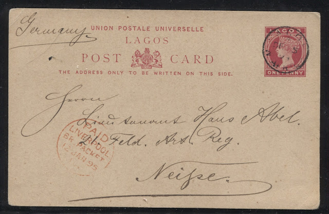 Another 1d red postcard, this time sent to Neijse in Germany. This one was sent on December 5, 1894. The cancellation is a 21 mm Lagos CDS that has a 4 mm gap between the "W" and "A".