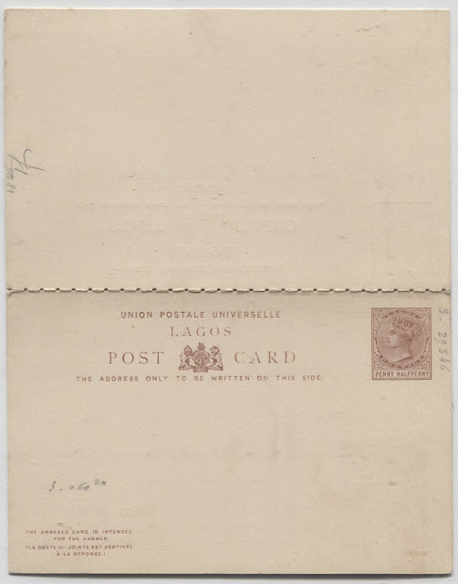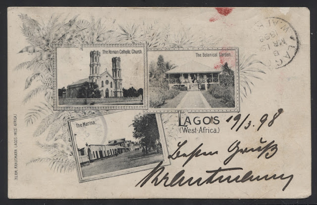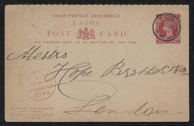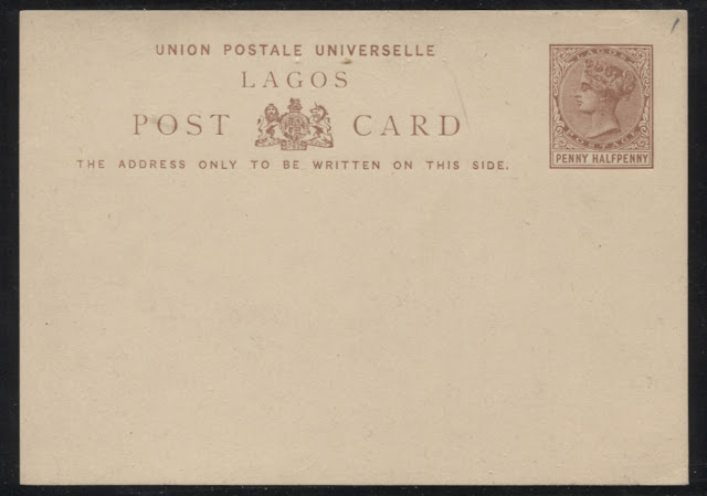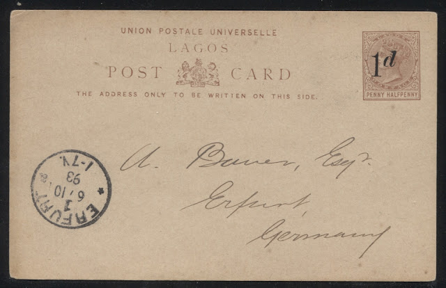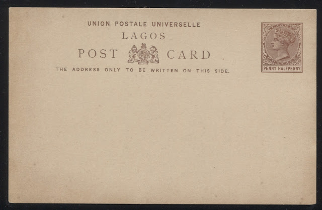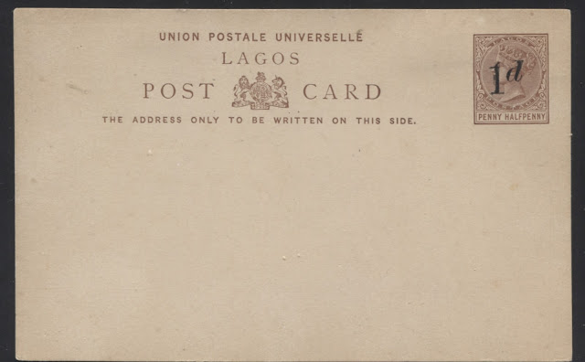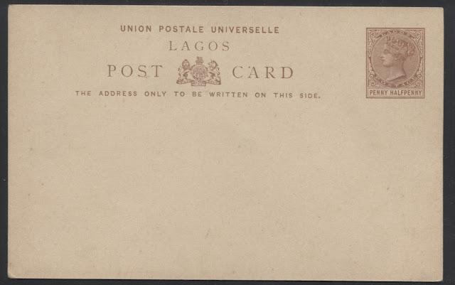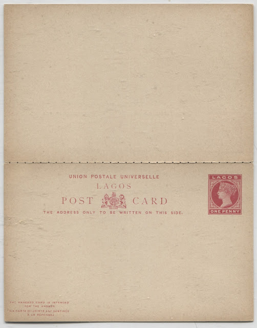 This week's post will present the postal history items in my collection that cover the Crown CA issues of the Queen Victoria period of the colony of Lagos. Unfortunately I do not have any covers from the crown CC period, as these are exceptionally rare. But I do have a nice range of covers and postcards from this period, and these will be the subject of this week's post.