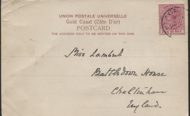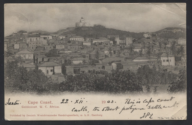 A Gold Coast postcard, showing Cape Coast in the God Coast, that has been used from Lagos instead, to Cheltenham, UK, on December 22, 1903. The postage has been paid with a single 1d crimson from plate 2. The stamp is cancelled with an incomplete strike of the 24 mm Lags CDS.