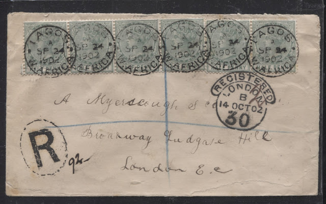 A 3d registered cover sent to Myerscough in London, on September 24, 1902. The postage has been paid with a strip of 6 of the 1/2d pale bluish green plate 2 printing. Each stamp is tied to the cover by a clear strike of a 24 mm Lagos CDS cancellation.