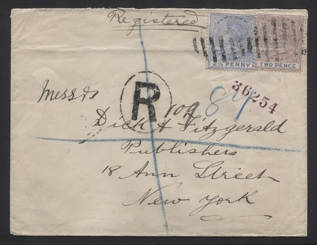 Another 4.5d registered cover franked with singles of the 2d and 2.5d stamps. This time it was sent on August 27, 1900. The 2.5d appears to be from an earlier state of the plate like state 2, while the 2d is from the third state.