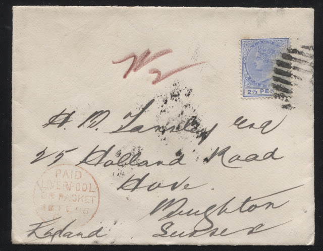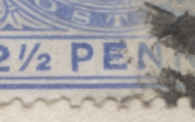 A 2.5d letter sent to Brighton, Sussex on January 18, 1896, and franked with a type 1 2.5d ultramarine. The stamp is tied by a strike of a 9-bar oval. Interstingly, this cover shows a prominent doubling of the "E" in Pence. A close up of this plate flaw is shown below: