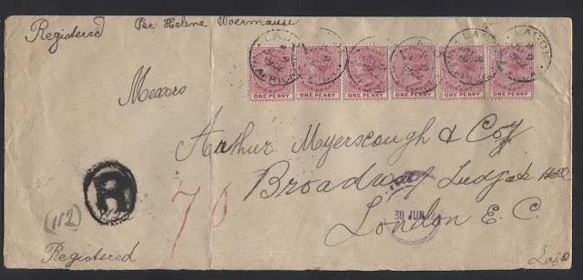 A 6d registered cover, also sent to Myerscough & Co in London, on June 9, 1902. The postage has been paid with a strip of 3 and 3 singles of the 1d plate 2, printed in carmine and deep aniline crimson. The stamps are tied by multiple strikes of 24 mm Lagos CDS cancellations.