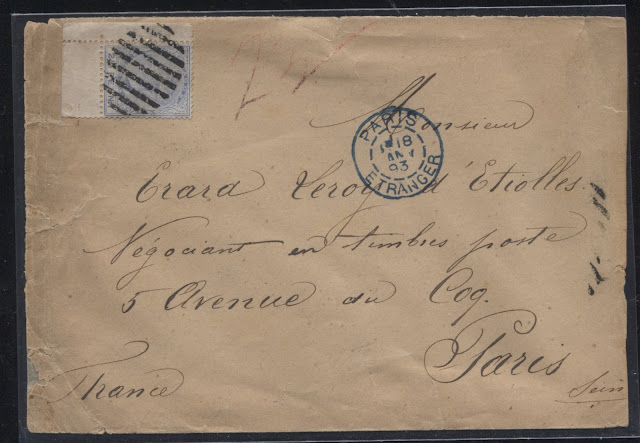 This is an early usage of the 2.5d ultramarine that is used on a letter sent to Paris on December 20, 1892. The stamp is cancelled with a lovely, clear strike of a 9-bar Lagos oval.
