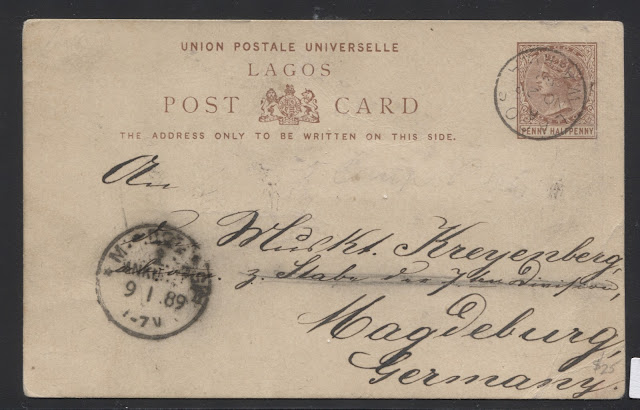 A 1.5d postcard that was mailed from Lagos on November 29, 1888, to Magdeburg, Germany. The cancellation is a 21 mm Lagos CDS with the 3 mm gap between the "W" and "A"