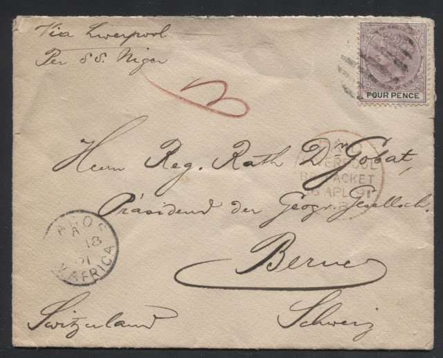A 4d cover sent from Lagos to Berne, Switzerland on March 18, 1891. This cover is franked with a single 4d lilac and black, from the first state of the plate. The stamp is cancelled with a clear strike of an 8-bar Lagos oval. The cover bears a strike of the 21 mm Lagos CDS with a 3 mm gap between the "W" and "A".