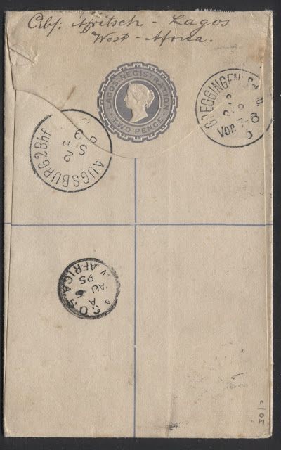 A 7d registered cover sent to Bavaria, Germany on August 6, 1895. The postage is paid by a single 4d lilac and black, and a 1d carmine. Both stamps appear to be from the third state of the plate, and both are tied with strikes of an 8-bar oval obliterator. The reverse of the envelope shows the 2d stamp indicta, printed in slate blue. Two transit backstamps appear, as well as a strike of a 21 mm Lagos CDS, with a 3 mm gap between the "W" and "A".