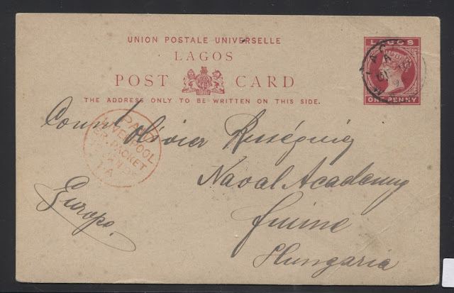 Another 1d postcard to Fiume, Hungary, that was sent from Lagos on December 10, 1894. The cancellation is a 21 mm Lagos CDS, with a 3 mm gap between the "W" and "A".