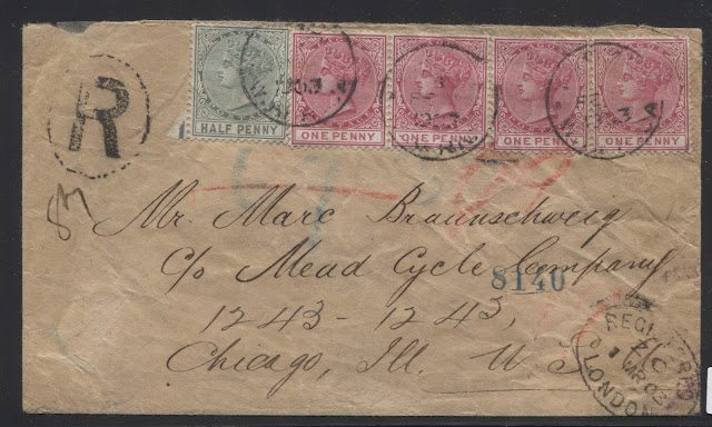 A 4.5d registered cover from Lagos to Chicago, Ill, sent on February 16, 1903. The postage in this case is paid with two pairs of the 1d and a single 1/2d green. All of the stamps are from plate 2, and are cancelled with a 24 mm Lagos CDS, dated March 1, 1903.