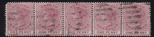 - A used strip of five stamps, which is the largest used multiple I have seen of this value.