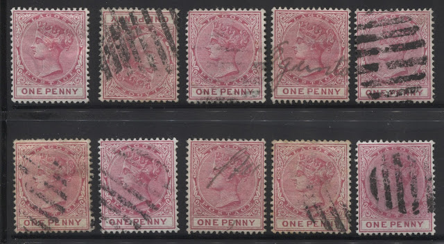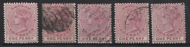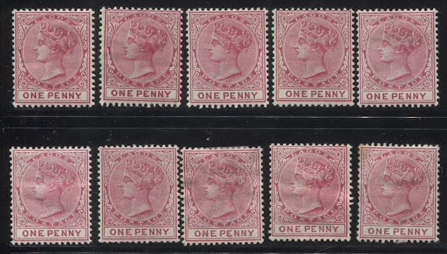 The above scan shows the first group of stamps from this printing, which were printed in the first of two combinations of inks. In this group the head plate colour is a match to Gibbons's rose carmine shade, while the duty plate colour is a match to Gibbons' carmine shade.