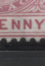 This must be a very rare variety, as this is only the second example I have seen among all of the 1d stamps that I have studied so far. It would appear that it may have originated with the crown CA printings of the 1d lilac stamps, because that is where I first saw it. However, it is entirely possible that it dates all the way back to the first crown CC issue of 1874, and that I simply do not have an example from that far back. This example does prove that the flaw was not corrected by 1894 and was constant.