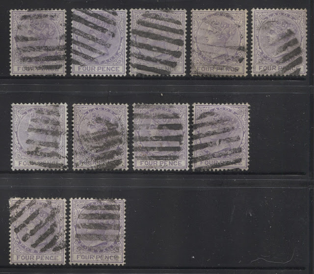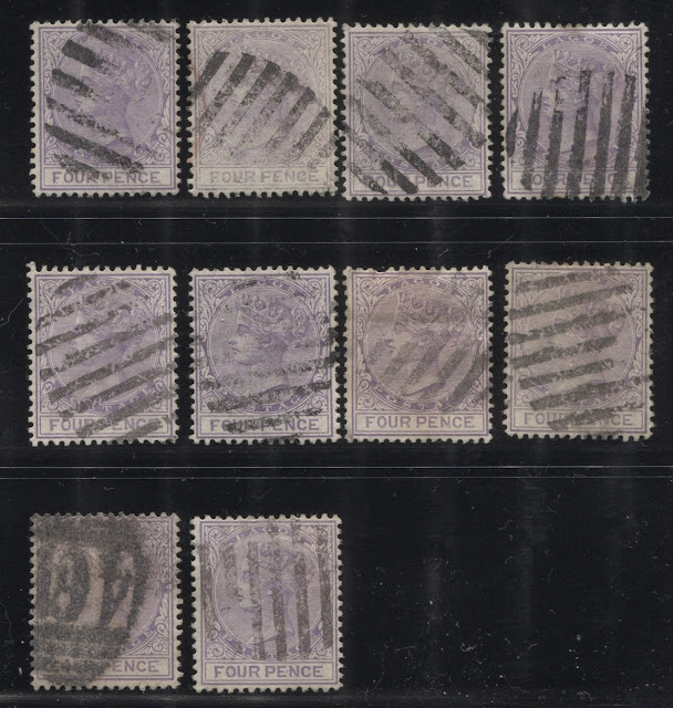 As was the case when I sorted the 2d stamps I initially identified 12 different shade groupings, which I consolidated into 11 groups on the basis of two of those groups being very similar to the other. So, once again, I believe that I have all 11 printings, though the assignment to specific printings is much more difficult, as I do not have a single CDS used example! Generally speaking, most of the characteristics of the early, mid and late printings were consistent with the other stamps I have studied so far. I did have one copy of the mint 4d with the same gum and stiff paper that I have come to regard as the first printings, which further supports the notion that this gum is genuine. However, I also have one mint example,with a thin, smooth colourless gum that is very reminiscent of the crown-CC stamps. I have not yet encountered this on the crown-CA stamps of this period, and I have no idea where to assign it in the sequence, so for now I have placed it as the second printing, since this does not conflict with my classifications of the 2d, which had the crackly gums starting with the third printing. One thing that I did notice that was different with regard to cancellations was that the 9-bar oval killers were not limited to the last printings. In fact, this cancellation type appears much earlier, though its use becomes more and more commonplace as time wears on.