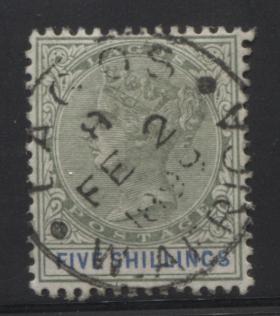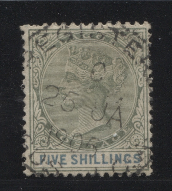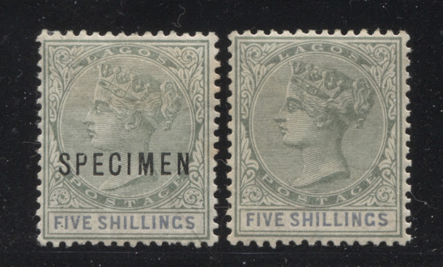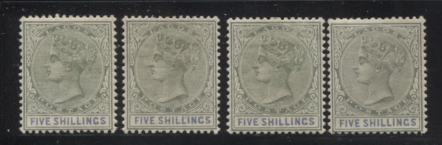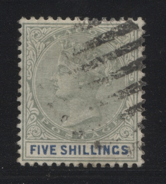 Today, I look at the printings of the next high value stamps in this series: the 5 /- green and blue. According to Ince, 28,320 stamps were dispatched to the colony between March 1887 and August 1901, while 18.900 remainders were destroyed. This makes the net issued quantity of 9,420 stamps, almost identical to the 2/6, yet curiously the catalogue value of this stamp is significantly higher than the 2/6. In any event, the catalogue values are extremely low relative to the true scarcity of these stamps. If we assume a survival rate in all grades of 10%, which is likely very generous, given that this is a West African crown colony, and not England or Canada, or some other country with a temperate climate and a population that is accustomed to preservation, then there are probably no more than 950 stamps in existence now - both mint and used.