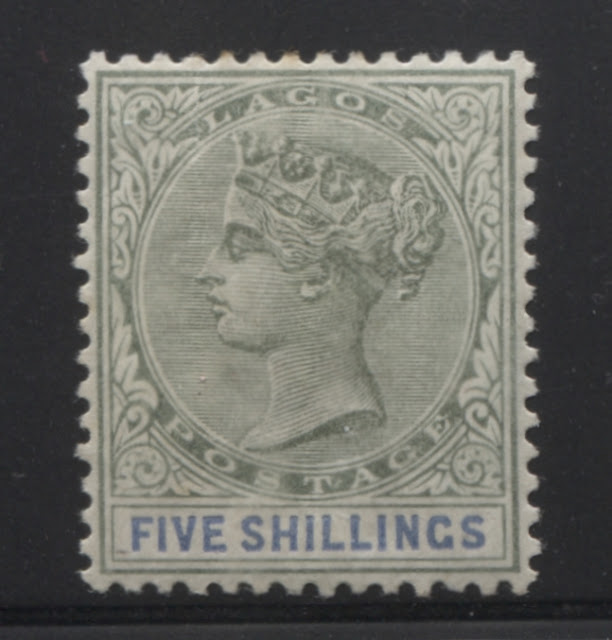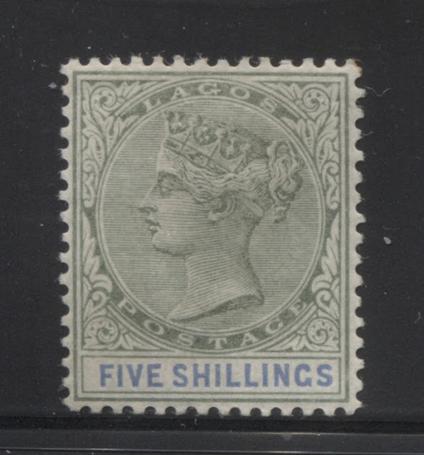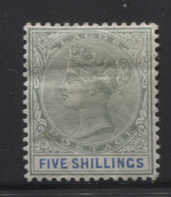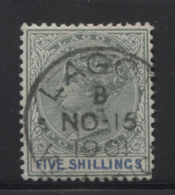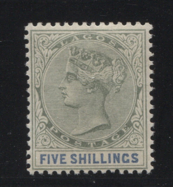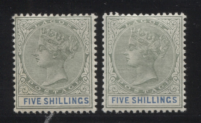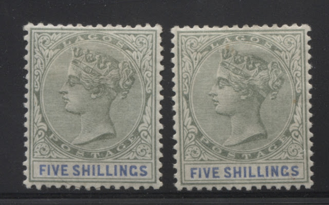 So this concludes my examination of the 5 shilling Lagos keyplate stamp of Queen Victoria. As you can see, there was a wide range of blues in the duty plate, with the blue shade being the most common. There was less variation in the head plate, with the common colour being deep dull green, and the dull greens and dull bluish greens being much less common. This leaves only three values in this series before I move on to the Edward VII issues: the 10 shilling, the halfpenny and the one penny. Next week I will cover the 10 shilling, and then in the following weeks, I will attempt to unravel the very complex halfpenny and one penny stamps.