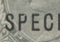The specimen overprint on the first stamp above shows a clear defect on the "P", which may or may not be a constant flaw. A close-up scan of this flaw is shown below: